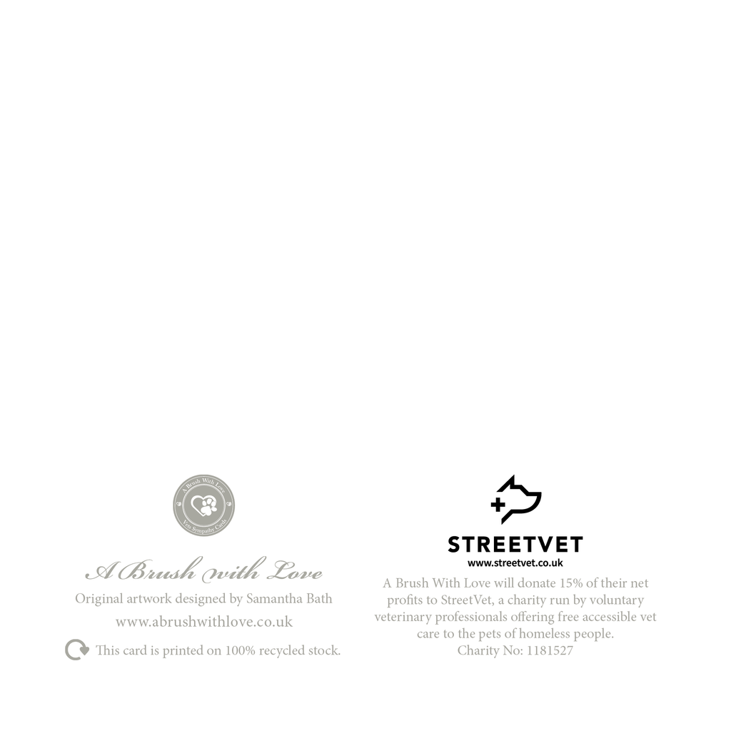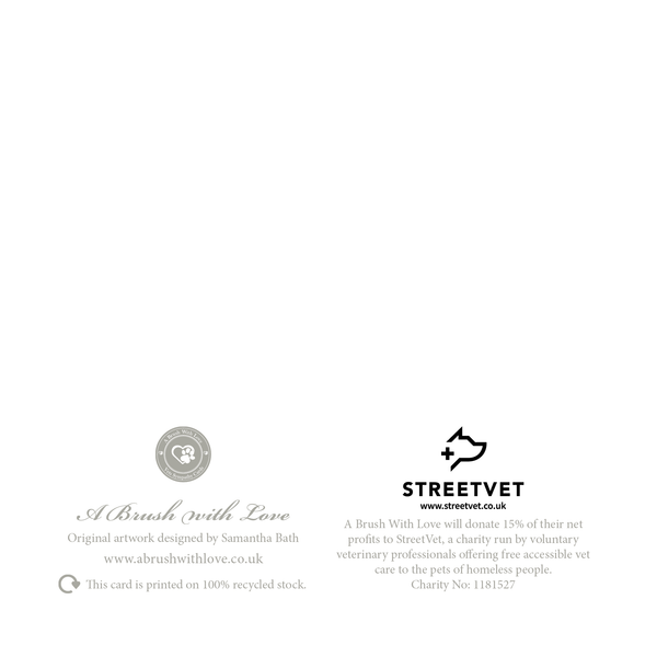 If uploaded, your logo will be placed in the middle of the card with your contact details underneath. At the bottom of the card on the left is our company and artist details, and on the right the StreetVet logo, the charity that our cards support.